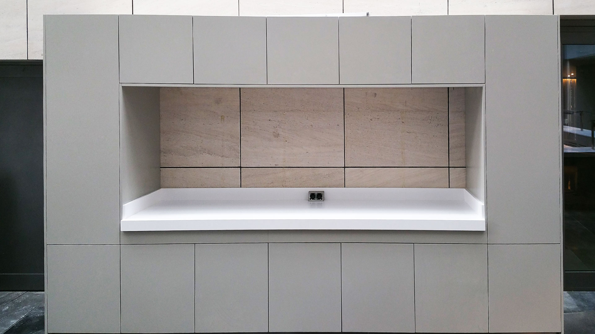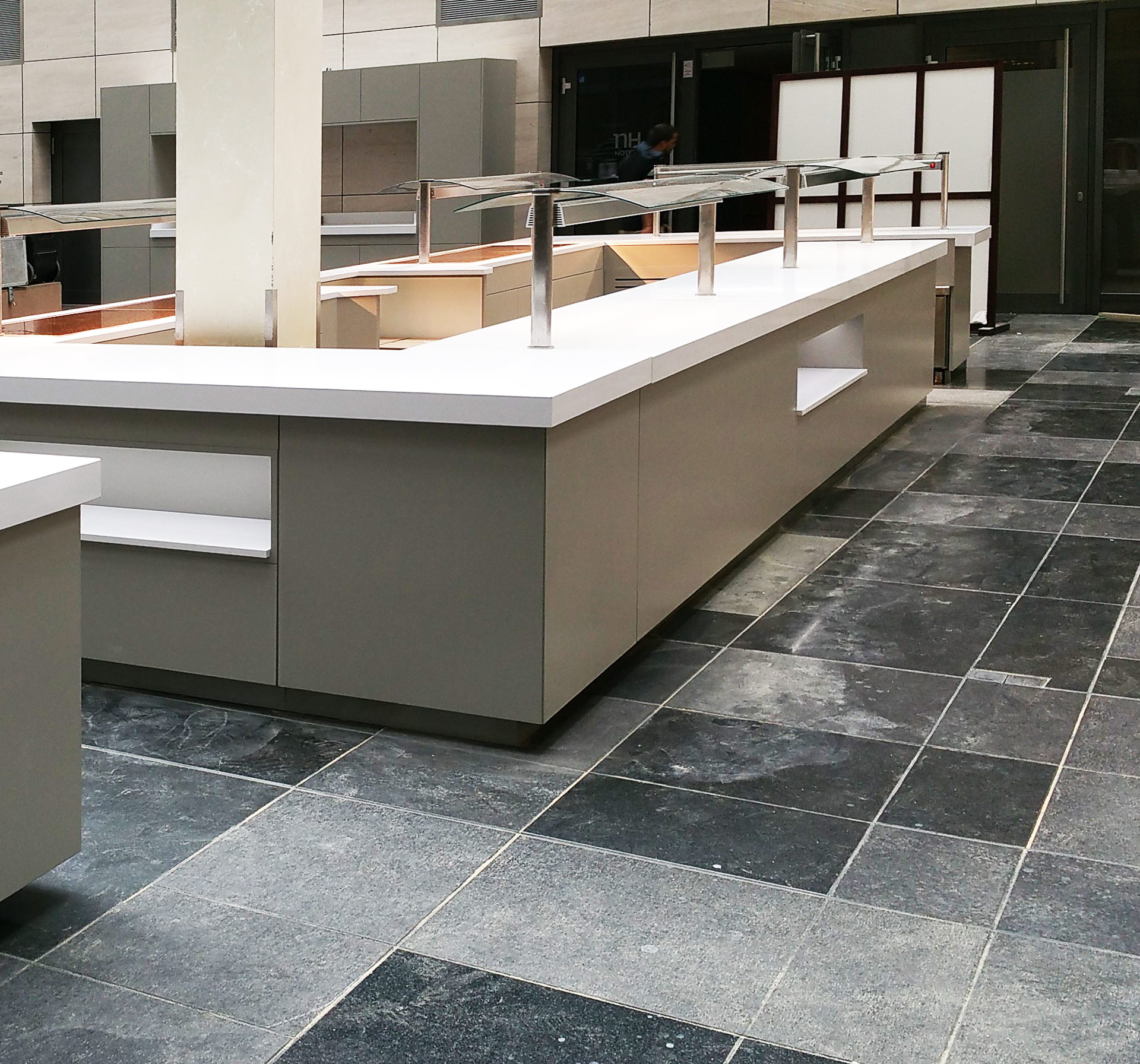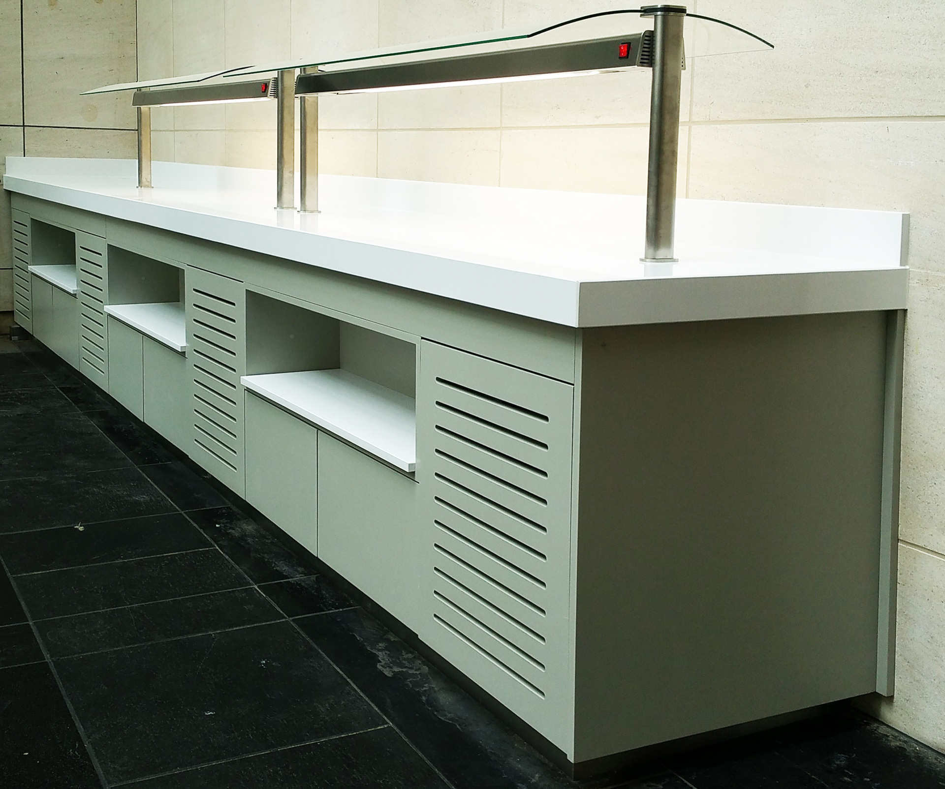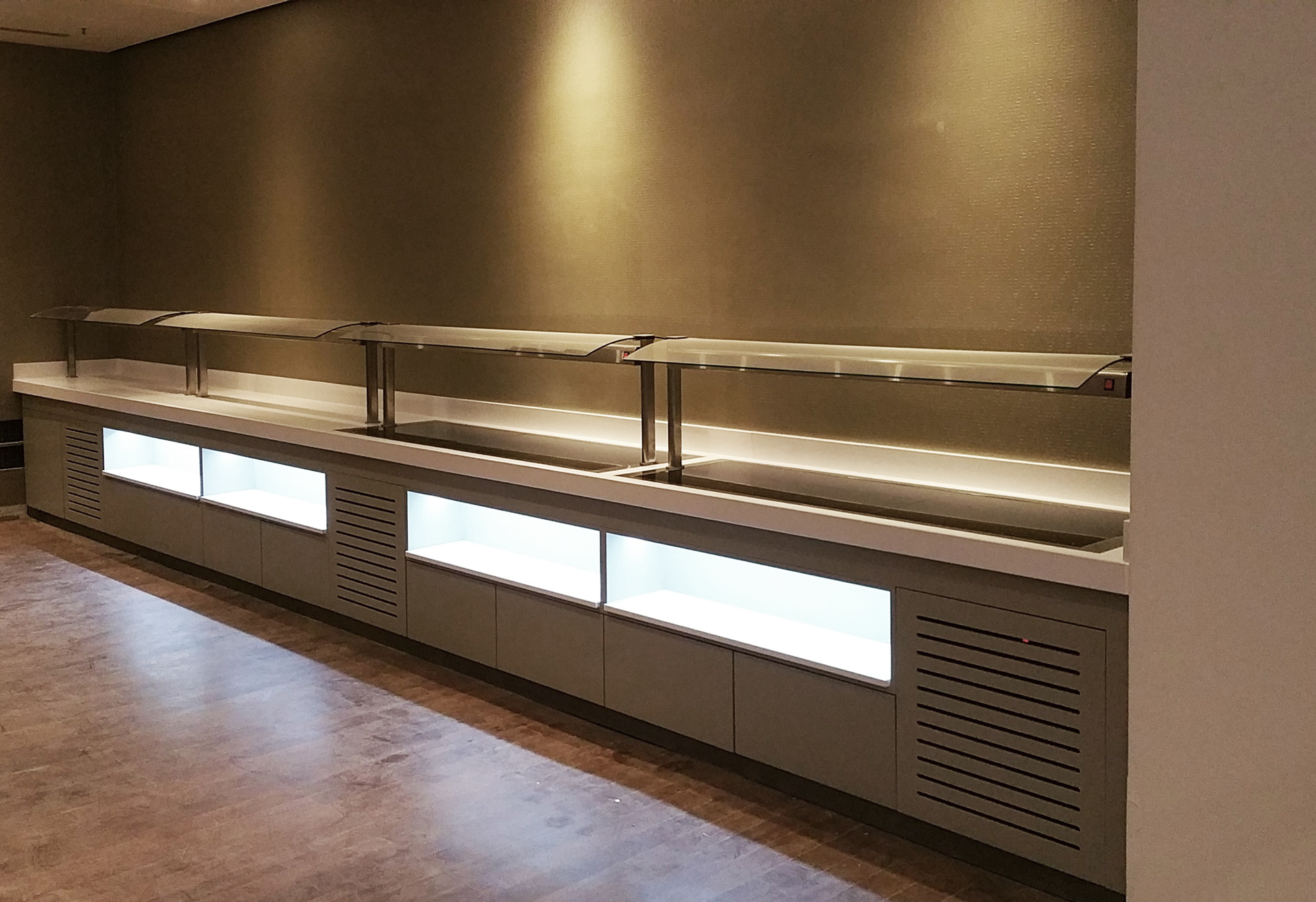 Muebles buffet con zonas calientes, frías y neutras, con muebles fabricados a medida.